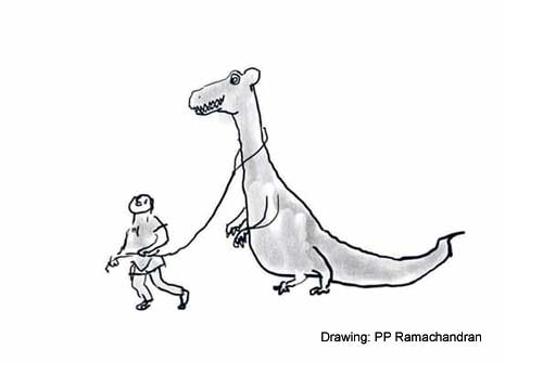 വായനക്കാരൻ അത് ഉൾക്കൊള്ളുമ്പോഴും ദിനോസറിന്റെ കുഞ്ഞിനെയും നയിച്ചുകൊണ്ടു പോകുന്ന ആ പയ്യന്റെ ചിത്രം മനസ്സിൽ നിറഞ്ഞു നിൽക്കും. ഹരികുമാറിന്റെ മരണത്തിൽ അനുശോചിച്ചു കൊണ്ട് കവി പി.പി.രാമചന്ദ്രൻ എഫ്.ബി.യിൽ പോസ്റ്റു ചെയ്ത രേഖാചിത്രം അതായിരുന്നു. പൊന്നാനിക്കളരിയിൽ എന്തൊക്കെയുണ്ട്. കേരളത്തിന്റെ വരയും പൊരുളും കവിതയും നാടകവും നല്ലൊരു പങ്ക് അവിടെ നിന്നാണ്. കഥയുള്ളവരാണ് അവർ.